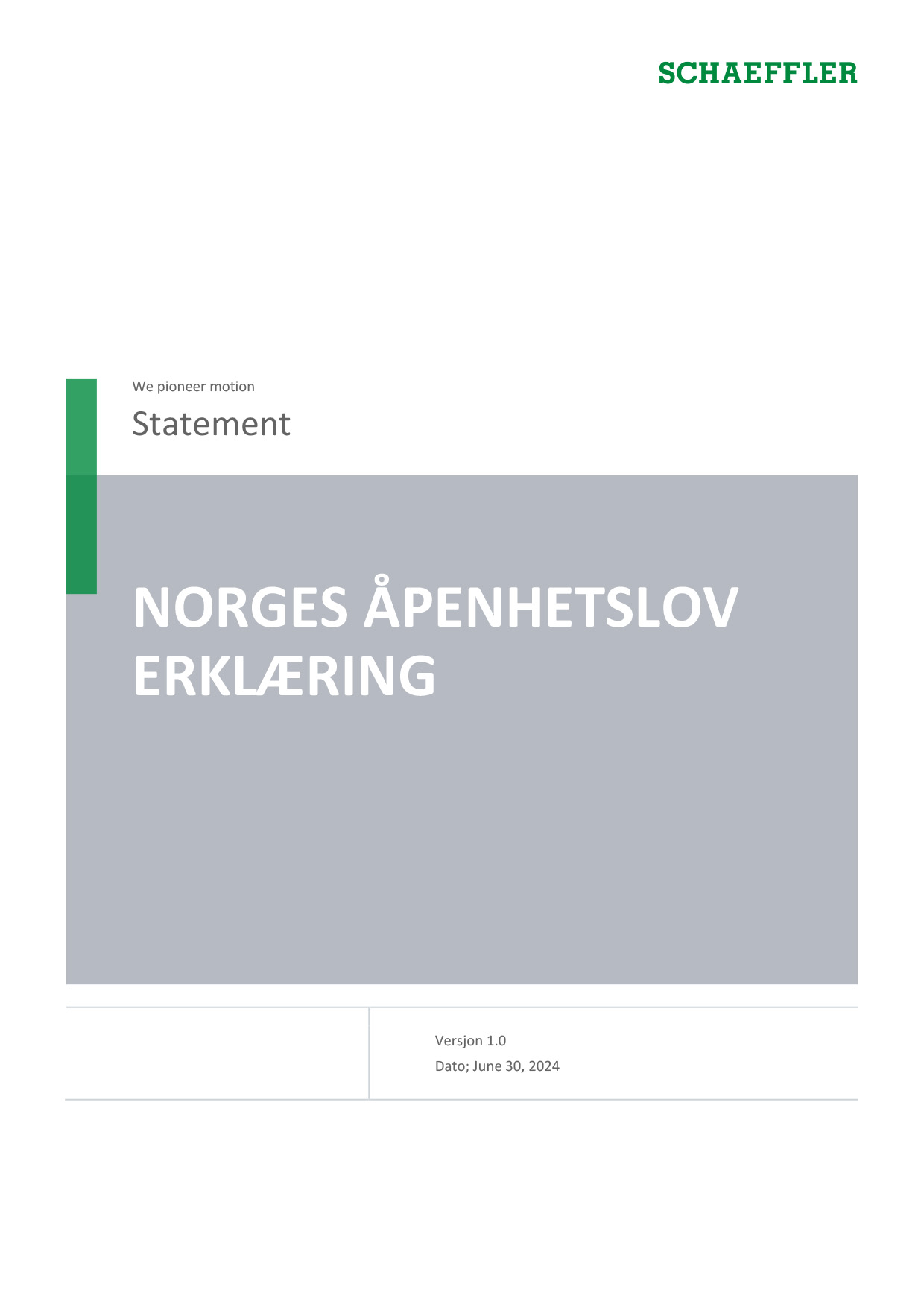 Denne erklæringen er avgitt av Schaeffler Norge AS i henhold til § 5 i den Norske åpenhetsloven ("loven"). Erklæringen beskriver tiltak som Schaeffler Norge AS har iverksatt i regnskapsåret 2023 for å håndtere faktiske og potensielle negative konsekvenser for grunnleggende menneskerettigheter og anstendige arbeidsforhold.