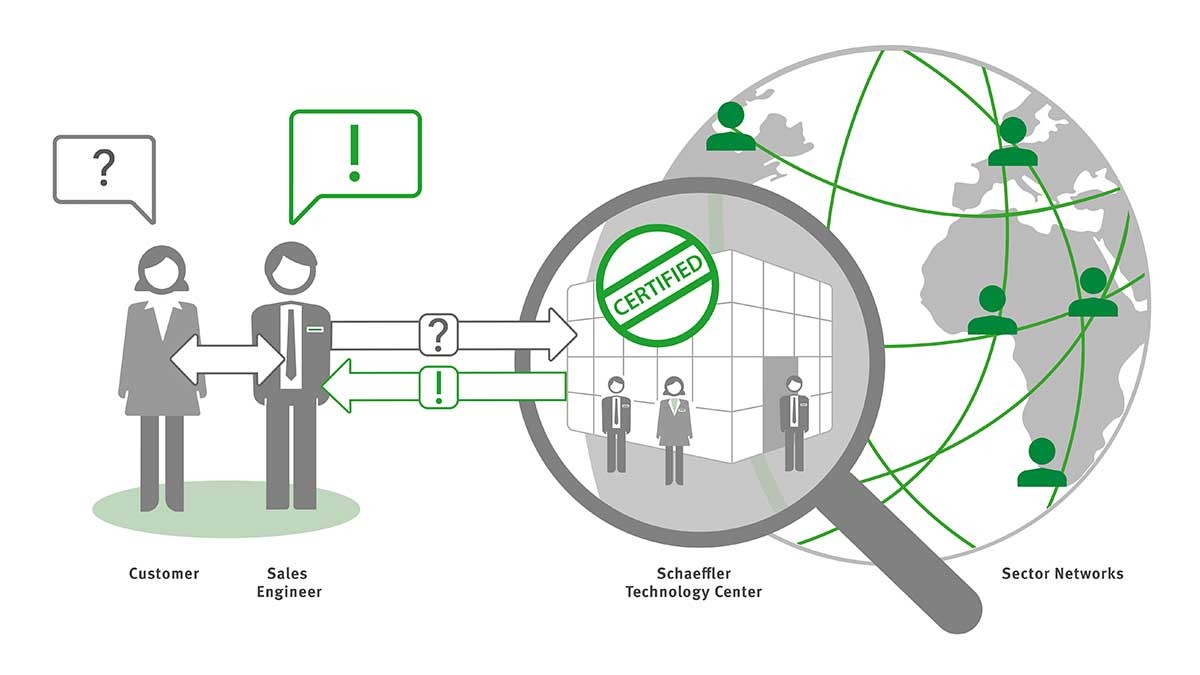Perhaps you have a question, or maybe you are facing a challenging project? Then it’s time to get in touch with your local Schaeffler representative - your sales engineer. If necessary, s/he can call upon an engineer from the Schaeffler Technology Center for assistance. Together, they can perform a wide range of tasks, such as carrying out complex calculations or providing mounting services. If your project requires it, our global network of experts gets involved: now your task is being worked on by Schaeffler experts around the world. The right solution, developed through the collaborative efforts of our vast knowledge network, is then presented to you by your local sales engineer.